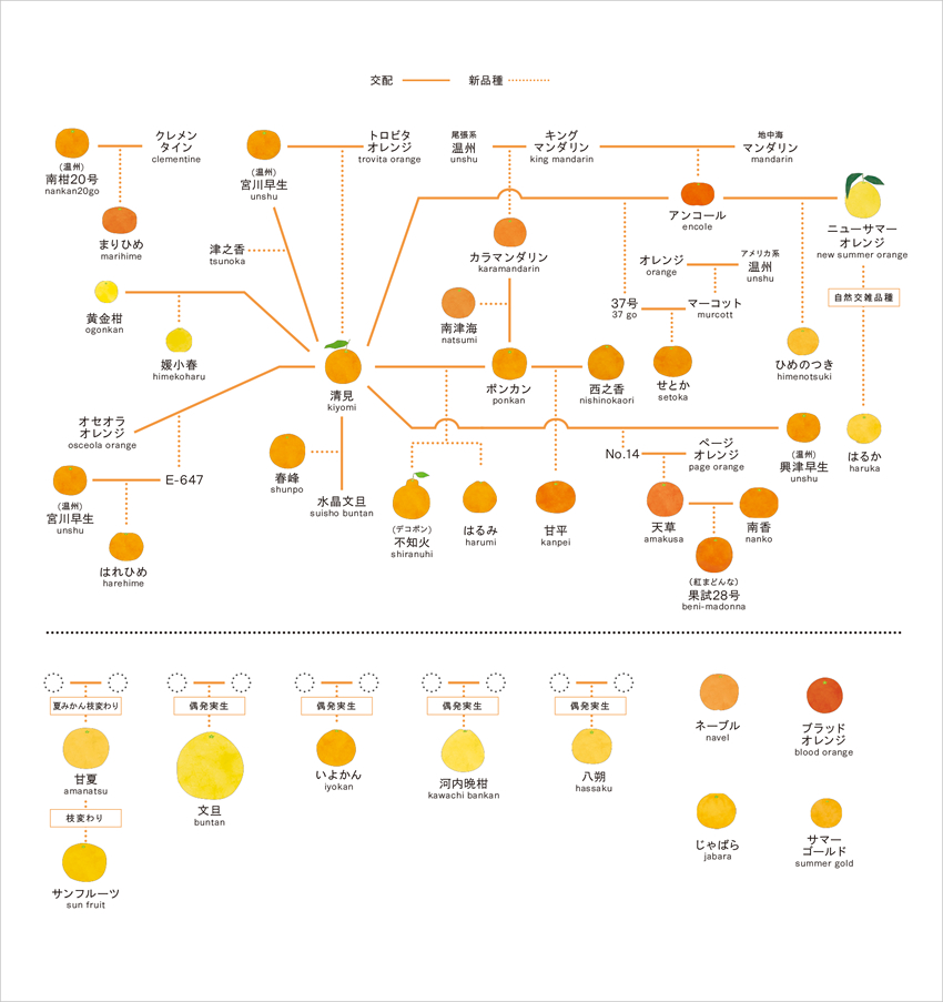みかんは新品種を完成させるのに10年以上かかるそうで、しかも品種の掛け合わせや互いの関係性がわからない品種が多く、昨年ゲノム解析が実現するまで謎の多い果物だったそうです。